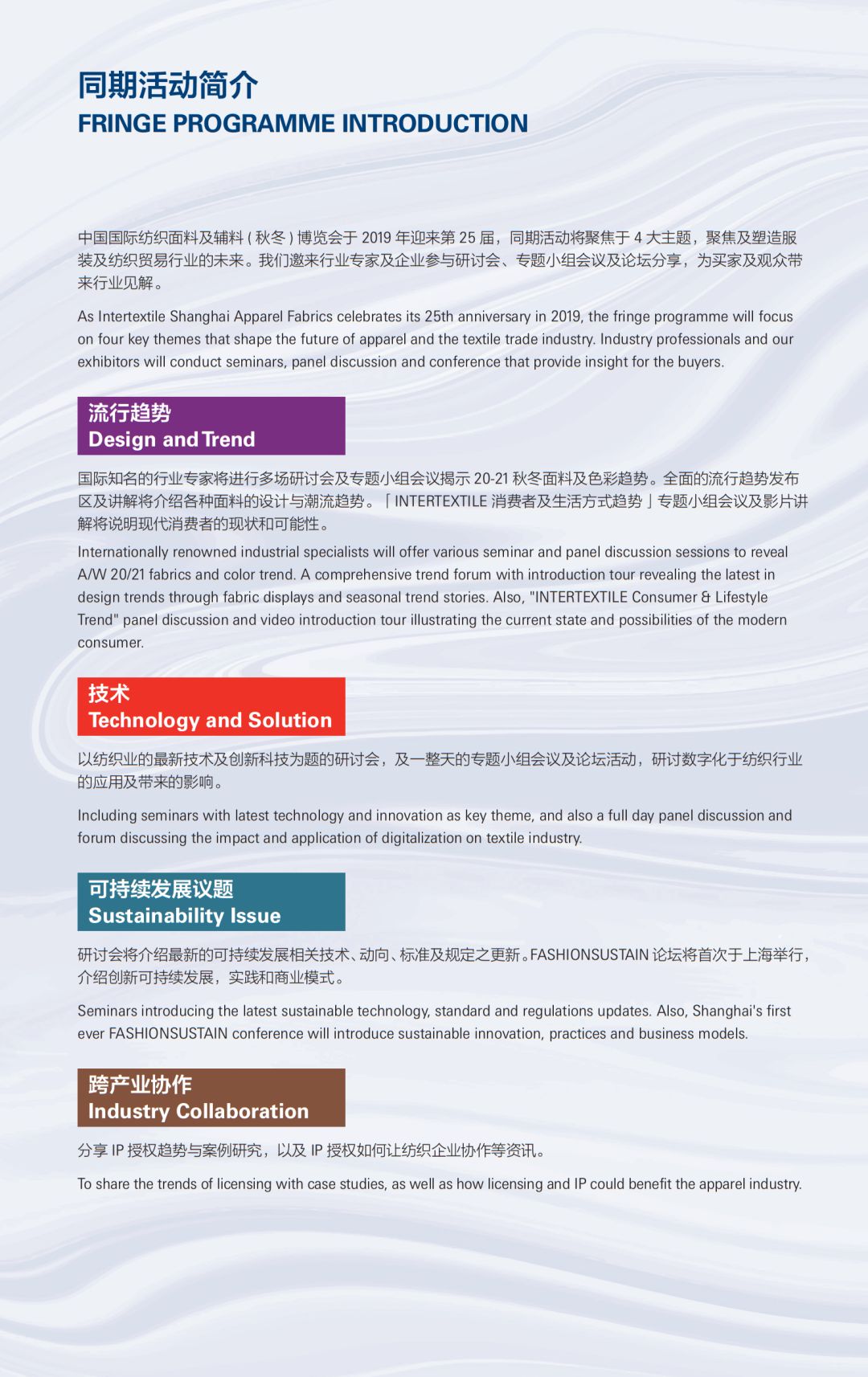 時尚女裝麵料、正裝麵料、休閑裝麵料、功能/運動裝麵料、襯衫麵料、內(nei) 衣麵料、嬰童麵料等多種展區以及躍動牛仔、輔料視界、花樣設計、可持續發展、精品毛紡、數碼印花等專(zhuan) 題展示區。