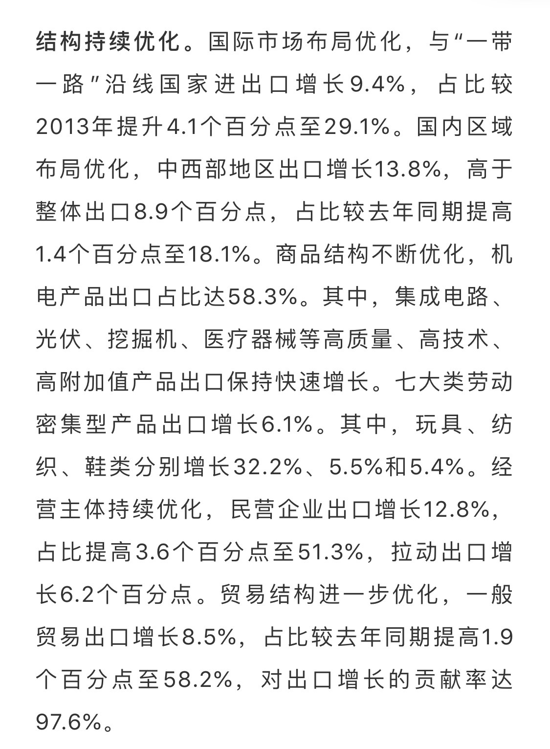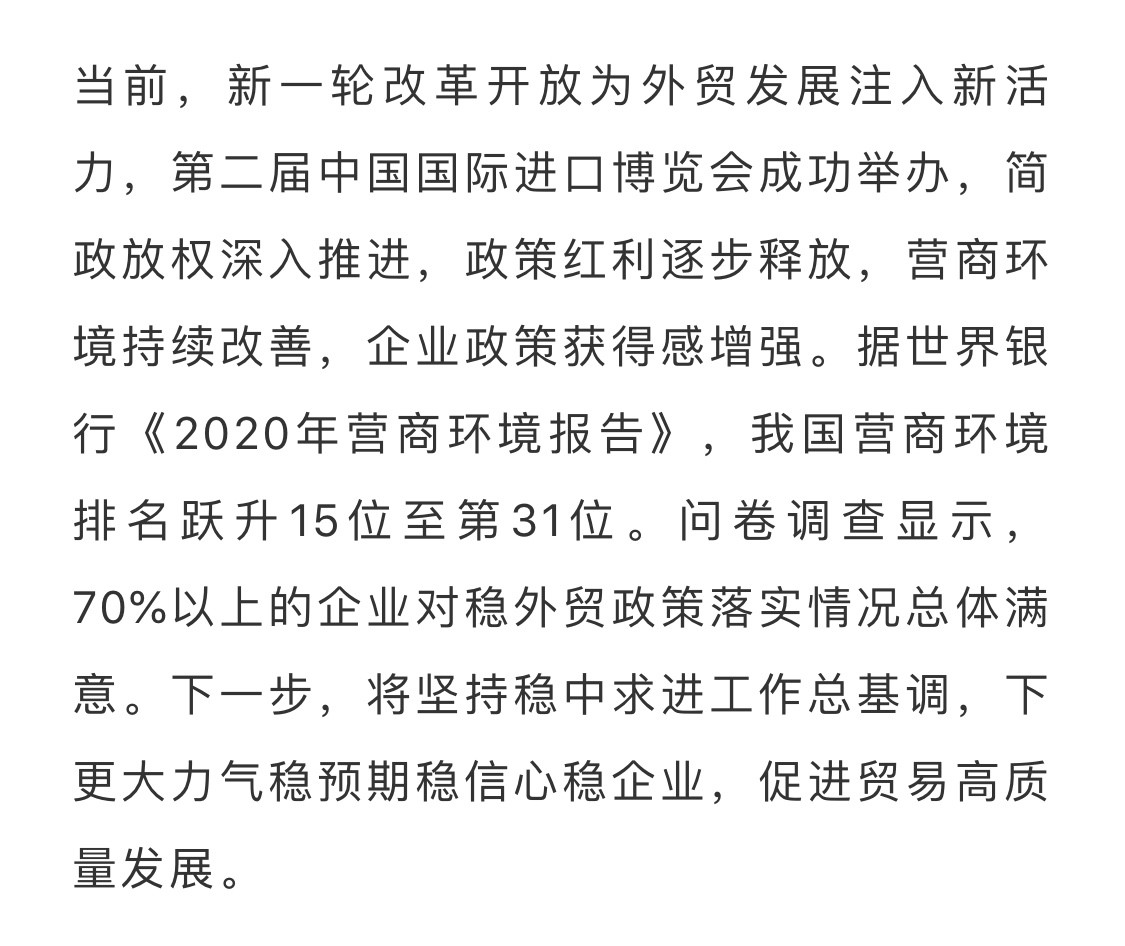 黨(dang) 中央、國務院高度重視外貿工作。10月23日,李克強總理主持召開國務院常務會(hui) 議,部署進一步做好穩外貿工作,推動進出口穩中提質。麵對複雜嚴(yan) 峻的外貿發展環境,商務部堅決(jue) 貫徹黨(dang) 中央、國務院決(jue) 策部署,紮實做好“穩外貿”工作,大力推動國際市場布局、國內(nei) 區域布局、商品結構、經營主體(ti) 和貿易方式等“五個(ge) 優(you) 化”,持續推進外貿轉型升級基地、國際營銷網絡和貿易促進平台等“三項建設”,積極推進貿易高質量發展,各項工作取得積極成效,1-10月外貿發展穩中提質。