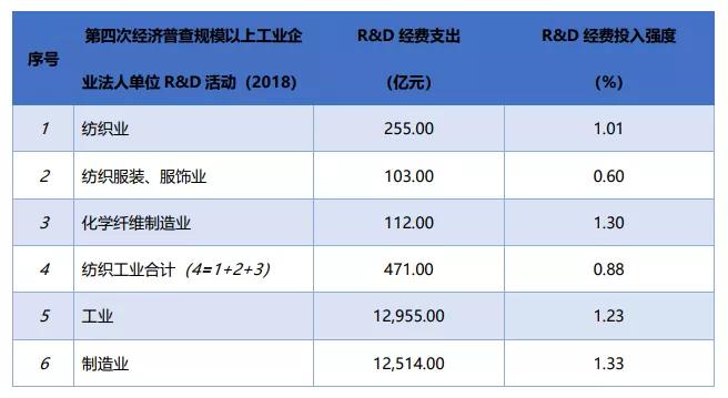 根據第四次經濟普查規模以上工業(ye) 企業(ye) 法人單位R&D活動(2018)和第三次經濟普查規模以上工業(ye) 企業(ye) 法人單位R&D活動(2013)數據顯示,2018年,我國紡織工業(ye) 的研究與(yu) 試驗發展(R&D)經費支出為(wei) 471.00億(yi) 元,占全國工業(ye) 的3.60%,占全國製造業(ye) 的3.70%;研究與(yu) 試驗發展(R&D)經費投入強度為(wei) 0.88%,相當於(yu) 全國工業(ye) 研究與(yu) 試驗發展(R&D)經費投入強度水平的71%,相當於(yu) 全國製造業(ye) 研究與(yu) 試驗發展(R&D)經費投入強度水平的66%;5年來,我國紡織工業(ye) 的研究與(yu) 試驗發展(R&D)經費支出增加了176.40億(yi) 元,投入強度增加了0.41%。