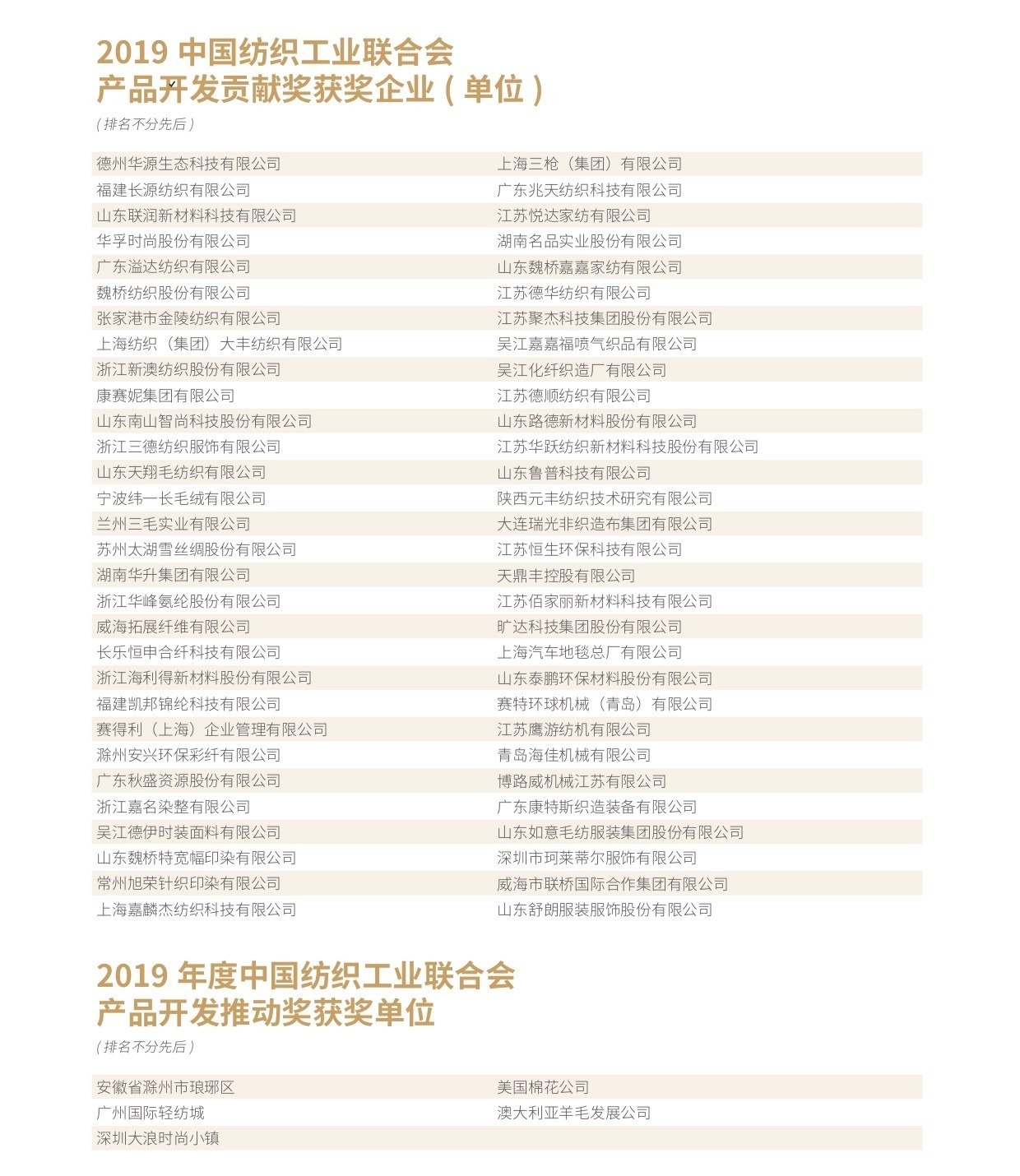 會議還為遼寧省海城市等197個紡織產業集群試點地區授牌。確定山東省昌樂縣等七個地區為紡織產業集群試點地區並授牌。頒發“集群地區紡織產業發展服務優秀單位獎”、“紡織產業集群試點工作推動優秀單位獎”。頒發“第八屆全國紡織行業管理創新成果獎”。頒發“2019年度十大類紡織創新產品獎”。頒發“2019年度中國紡織工業聯合會產品開發貢獻獎”。