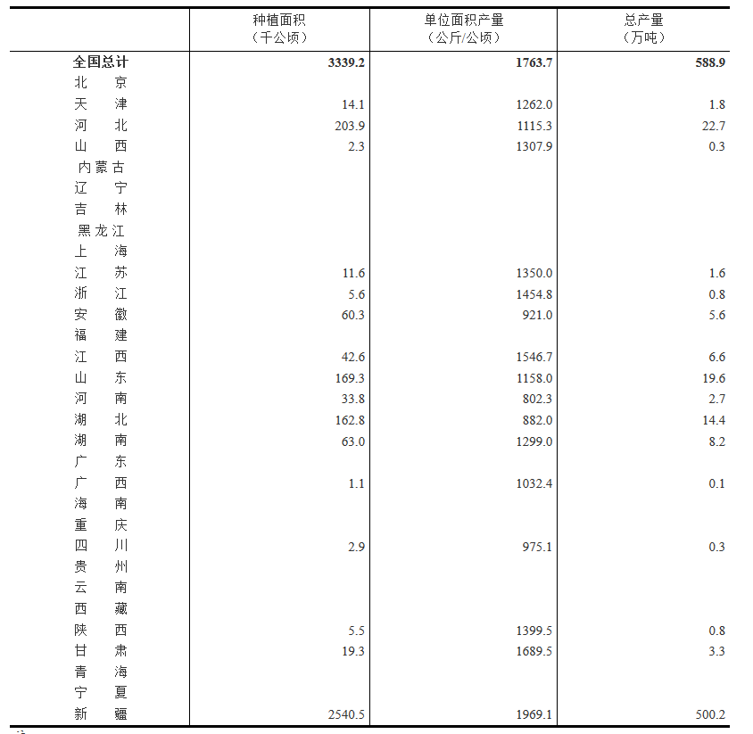 2、北京、內(nei) 蒙古、遼寧、上海、福建、貴州、雲(yun) 南的棉花產(chan) 量因不足0.1萬(wan) 噸,未列出;吉林、黑龍江、廣東(dong) 、海南、重慶、西藏、青海、寧夏等省(區、市)沒有棉花生產(chan) 。