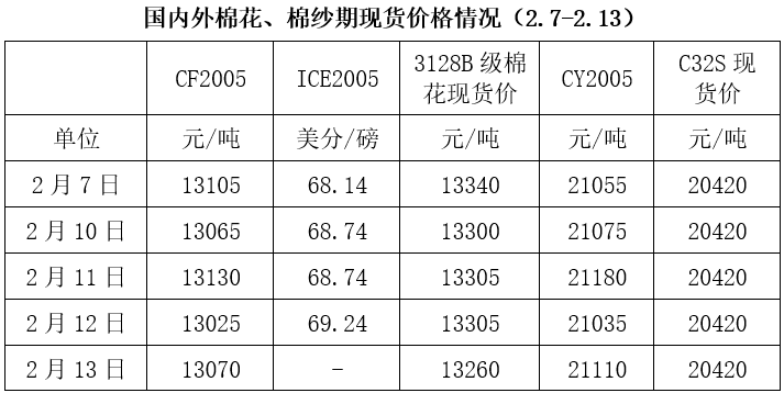 2月7日-13日,市場價(jia) 格雖有小幅波動但相對平穩。期貨市場,國內(nei) 鄭棉主力合約(CF2002)2月13日結算價(jia) 為(wei) 13070元/噸,較上周同期結算價(jia) 上漲35元/噸;美棉期貨(ICE2005),當地時間2月12日結算價(jia) 為(wei) 69.24美分/磅,價(jia) 格相對平穩;鄭州棉紗主力合約(CY2005)小幅上漲,2月13日結算價(jia) 為(wei) 21110元/噸,較上同期上漲140元/噸。從(cong) 國內(nei) 現貨市場看,2月13日,國內(nei) 3128B棉花價(jia) 格指數為(wei) 13260元/噸,整體(ti) 較上周上漲300元/噸以上,純棉32支普梳紗價(jia) 格指數(CY C32S)較為(wei) 平穩,為(wei) 20420元/噸,變化不大。