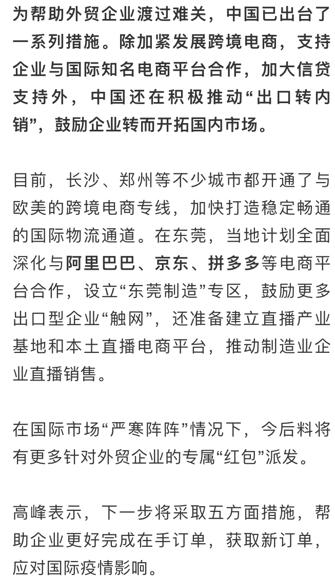 高峰透露,從(cong) 近期商務部對重點省市、各進出口商會(hui) 和重點企業(ye) 摸底調研情況來看,外貿企業(ye) 依然麵臨(lin) 在手訂單取消或延期、新訂單簽約困難、物流不暢等諸多困難。