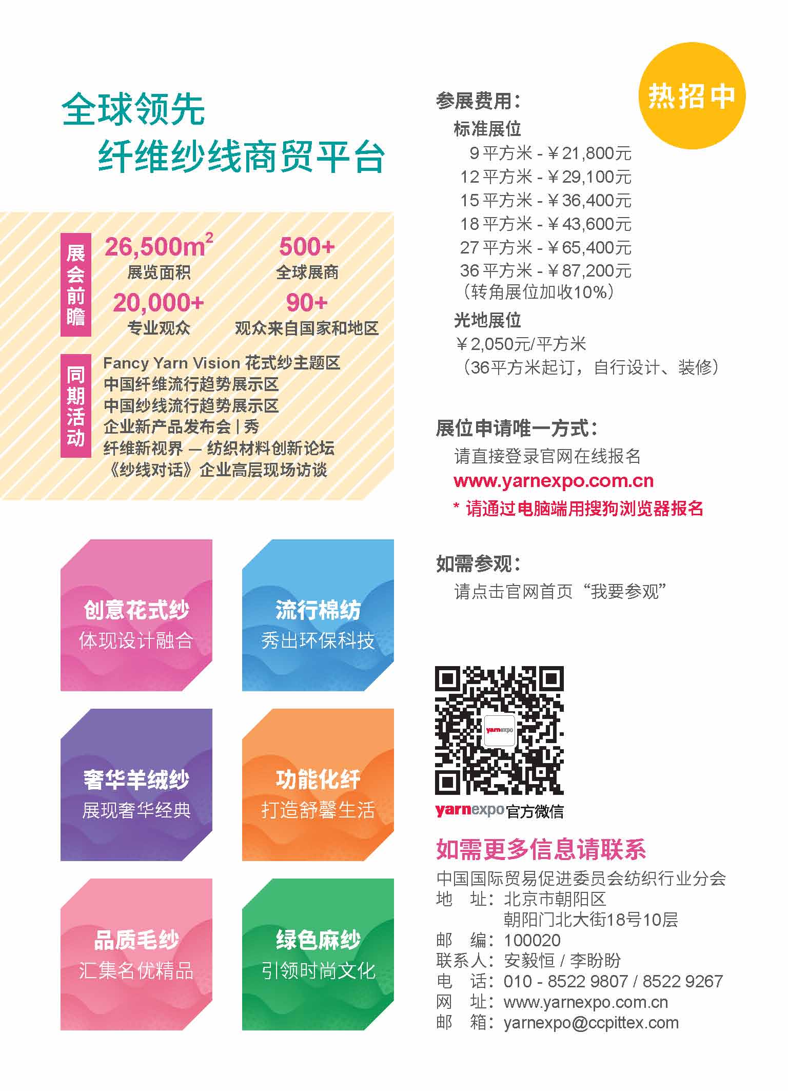 乘著yarnexpo大灣區紗線展的良好商貿勢頭,第十七屆(簡稱“2020yarnexpo秋冬紗線展”)也將於2020年9月23-25日在國家會展中心(上海)與intertextile麵輔料展、CHIC服裝展、PHValue伟德国际英国展同期同館舉辦,成為今年下半年常態化疫情防控時期舉辦的中國紡聯旗下又一個實體聯展。產業上下遊展會聯動,一站式商貿效果顯著,為行業企業決勝下半場助力!