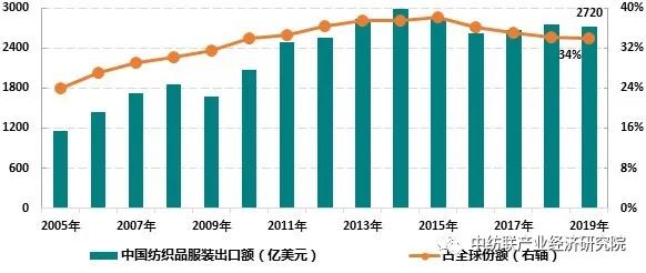 中國紡織行業(ye) 在國際出口市場保持了穩定的規模優(you) 勢,在全球出口總額中所占份額僅(jin) 輕微下降。根據WTO數據,2019年我國共計出口紡織品服裝2720億(yi) 美元,占同期全球出口紡織品服裝金額34%,較2018年34.2%的份額微降0.2個(ge) 百分點。我國紡織品出口競爭(zheng) 力有所提升,2019年出口額為(wei) 1200億(yi) 美元,占全球紡織品出口金額的39.2%,較2018年提升1.3個(ge) 百分點,反映出我國紡織麵料、化纖等產(chan) 品在國際供應鏈中作用提升。2019年我國服裝出口額為(wei) 1520億(yi) 美元,占全球服裝出口金額的30.8%,較2018年下降1.1個(ge) 百分點。