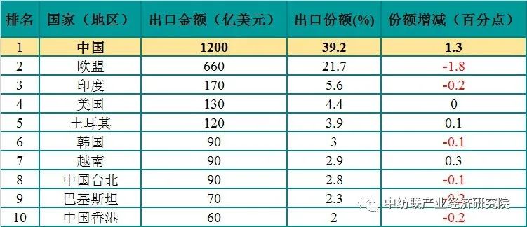 表1:2019年世界紡織品出口前10名