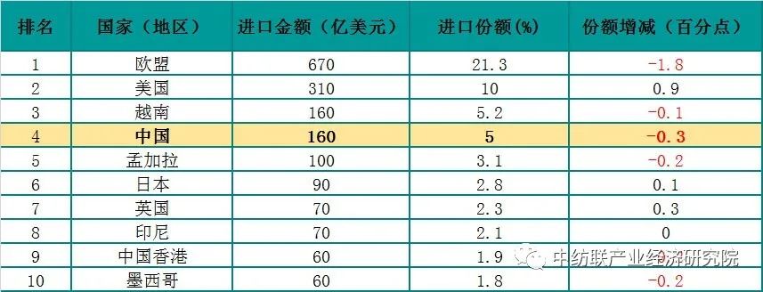 從(cong) 紡織品和服裝進出口前10位的國家和地區來看,各主要進出口國家及地區位次變化不大。越南、孟加拉、土耳其出口市場份額保持提升態勢。美國進口份額提升,歐盟進口份額下降。
