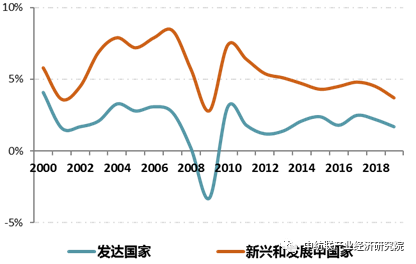 圖1:2000~2019年發達和發展中國家GDP增長情況