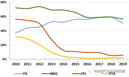 圖2:我國滌綸、錦綸上遊原料對外依存度曆年變化情況