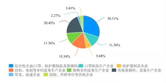 企業(ye) 類型方麵,樣本企業(ye) 涉及防疫紡織品全產(chan) 業(ye) 鏈。圖2所示,其中30%的企業(ye) 為(wei) 綜合性企業(ye) ,該類企業(ye) 通常同時生產(chan) 口罩/防護服和非織造布等產(chan) 品,11%的企業(ye) 單獨生產(chan) 口罩,6%的企業(ye) 單獨生產(chan) 防護服,三者合計有83家(47%)。紡粘、水刺等非織造布企業(ye) 占15%,熔噴非織造布企業(ye) 占11%,透氣膜、非織造布設備及部件、口罩機及貼條機、口罩帶、鼻夾等原輔料和設備企業(ye) 占21%,高校科研單位占4%,貿易流通企業(ye) 占2%。口罩、防護服的相關(guan) 企業(ye) 中其中疫情前正常運營的既有企業(ye) 占42%,其餘(yu) 累計51%為(wei) 疫情後原料、服裝、家紡、衛生用品、食品等相關(guan) 製造業(ye) 的轉產(chan) 企業(ye) ,其他7%是來自非製造業(ye) 的轉產(chan) 企業(ye) 。