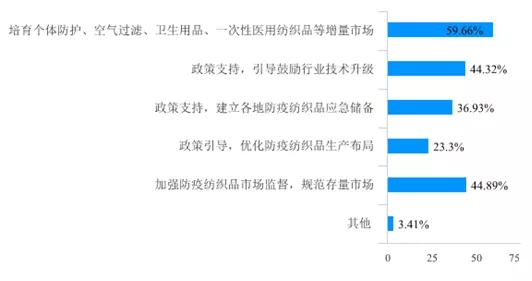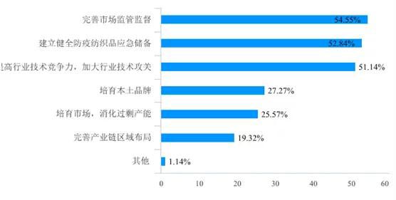 行業(ye) 短期健康發展最迫切的問題方麵,圖6所示,在完善市場監管監督、建立健全防疫紡織品應急儲(chu) 備、提高行業(ye) 技術競爭(zheng) 力加大行業(ye) 技術攻關(guan) 、培育本土品牌、培育市場並消化過剩產(chan) 能、完善產(chan) 業(ye) 鏈區域布局這6個(ge) 問題中,排名前3位的問題是:55%的企業(ye) 建議完善市場監管監督,53%的企業(ye) 建議建立健全防疫紡織品應急儲(chu) 備,51%的企業(ye) 建議提高行業(ye) 科技競爭(zheng) 力,加大行業(ye) 技術攻關(guan) 。
