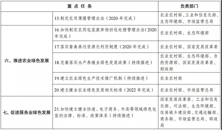 (八)推進農(nong) 業(ye) 綠色發展。以綠色生態為(wei) 導向,創新農(nong) 業(ye) 綠色發展體(ti) 製機製,開展農(nong) 業(ye) 綠色發展支撐體(ti) 係建設,創新技術體(ti) 係、健全標準體(ti) 係、延伸產(chan) 業(ye) 體(ti) 係、強化經營體(ti) 係、完善政策體(ti) 係,為(wei) 農(nong) 業(ye) 綠色發展提供保障。大力推進科學施肥,建立有機肥替代化肥推廣政策機製。實施化學農(nong) 藥減量替代計劃,建立生物防治替代化學防治推廣政策機製,支持研發推廣農(nong) 作物病蟲害綠色防控技術產(chan) 品。製定農(nong) 用薄膜管理辦法,建立全程監管體(ti) 係,支持推廣使用生物可降解農(nong) 膜。加快製定農(nong) 藥包裝廢棄物回收處理管理辦法。完善農(nong) 作物秸稈綜合利用製度,以縣為(wei) 單位整體(ti) 推進秸稈全量化綜合利用。以肥料化和能源化為(wei) 主要利用方向,落實畜禽糞汙資源化利用製度。完善落實水產(chan) 養(yang) 殖業(ye) 綠色發展政策,依法加強養(yang) 殖水域灘塗統一規劃。建立飼料添加劑和獸(shou) 藥使用規範,健全病死畜禽無害化處理機製。穩步推進耕地輪作休耕製度試點。健全農(nong) 業(ye) 循環經濟推廣製度,建立農(nong) 業(ye) 綠色生產(chan) 技術推廣機製。落實農(nong) 業(ye) 綠色發展稅收支持政策。建立健全農(nong) 業(ye) 綠色發展相關(guan) 標準,加快清理、廢止與(yu) 農(nong) 業(ye) 綠色發展不適應的標準和行業(ye) 規範。(農(nong) 業(ye) 農(nong) 村部、國家發展改革委、工業(ye) 和信息化部、財政部、自然資源部、生態環境部、水利部、稅務總局、市場監管總局等按職責分工負責)