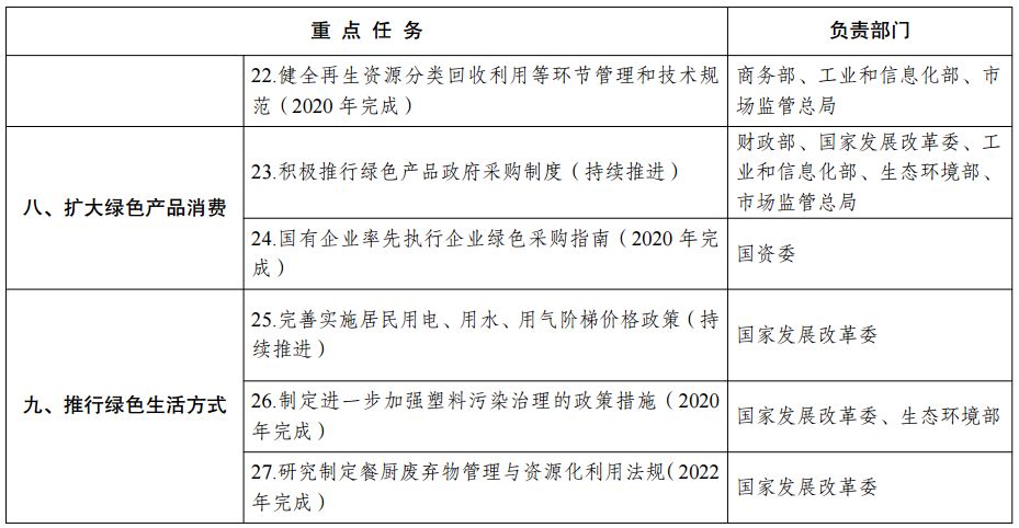 (十一)推行綠色生活方式。完善居民用電、用水、用氣階梯價(jia) 格政策。落實汙水處理收費製度,將汙水處理費標準調整至補償(chang) 汙水處理和汙泥處置設施運營成本並合理盈利水平。加快推行城鄉(xiang) 居民生活垃圾分類和資源化利用製度。製定進一步加強塑料汙染治理的政策措施。研究製定餐廚廢棄物管理與(yu) 資源化利用法規。推廣綠色農(nong) 房建設方法和技術,逐步建立健全使用綠色建材、建設綠色農(nong) 房的農(nong) 村住房建設機製。(國家發展改革委、生態環境部、住房城鄉(xiang) 建設部、財政部等按職責分工負責)