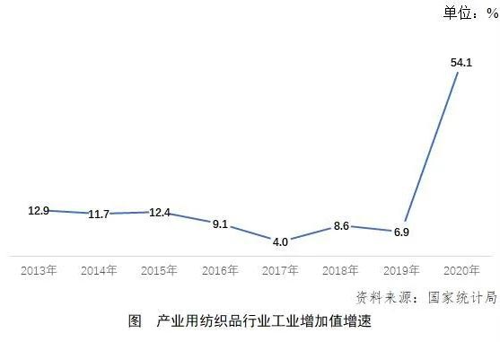 根據國家統計局數據,2020年我國產(chan) 業(ye) 用紡織品行業(ye) 規模以上企業(ye) 的工業(ye) 增加值同比大幅增長54.1%(如圖)。根據中國產(chan) 業(ye) 用紡織品行業(ye) 協會(hui) (以下簡稱“協會(hui) ”)對330家樣本企業(ye) 的調研,行業(ye) 2020年的景氣指數為(wei) 80.4,高於(yu) 上年同期水平,處於(yu) 較高的景氣區間。