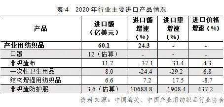 在主要進口產(chan) 品中,口罩的進口需求最大,其進口額約12億(yi) 美元,其中前四個(ge) 月的進口額占總進口額的比重超過了七成,非織造布和非織造防護服的進口額分別為(wei) 11.2億(yi) 美元和3.6億(yi) 美元,結構增強用紡織品的進口額達到6.6億(yi) 美元,同比增長7.2%,一次性衛生用品的進口需求出現下降,降幅達到24.4%(見表4)。