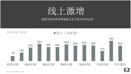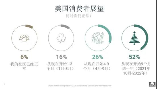 去年美國消費者對疫情非常擔憂,到年底還有59%的受訪者擔憂疫情,同時又高達53%的受訪者說有家人或好友染病。在今年年初做的美國消費者調研中,有52%的受訪者預測受疫情影響的生活將會(hui) 在今年10月份到2022年10月份才能逐步恢複正常。