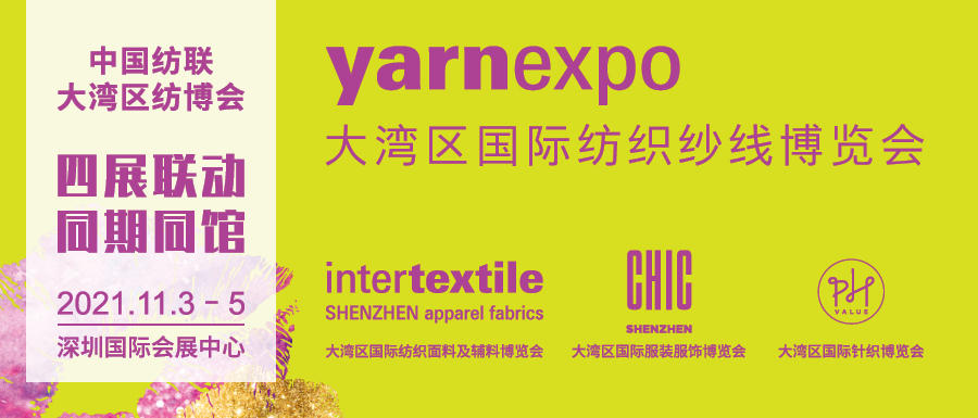 11月3-5日,第二屆yarnexpo大灣區國際紡織紗線博覽會(hui) (簡稱2021yarnexpo大灣區紗線展)將聯袂下遊展會(hui) 在深圳國際會(hui) 展中心(寶安新館)再次亮相!