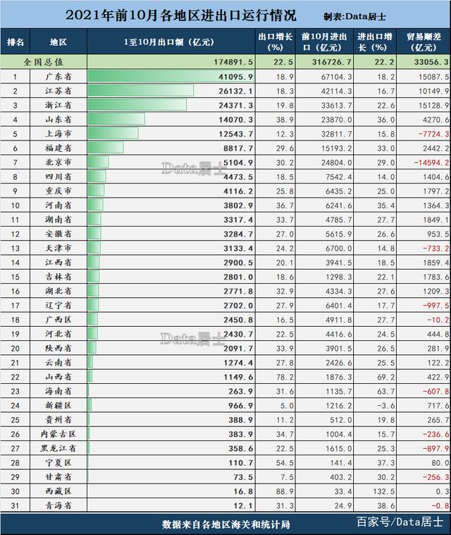 而三大強省雖然增速一般,都不到20%,但因為(wei) 基數無比龐大,想要獲得更快的增幅確實也是困難更大的。在前10月內(nei) 還能夠有19%左右的增長率,已經非常不錯了,是全國出口穩健上行的壓艙石呀,尤其在順差方麵貢獻巨大。