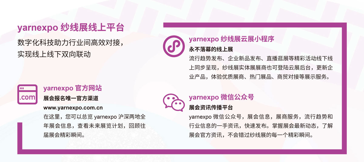 2022yarnexpo春夏紗線展作為(wei) 全球領先的纖維紗線重要商貿平台,纖維新材料、新技術、新產(chan) 品和新趨勢的展示推廣合作和首發平台,將繼續與(yu) intertextile麵輔料展、intertextile家紡展、CHIC服裝展、PHValue伟德国际英国展同期同地舉(ju) 辦。