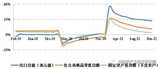 2021年,雖然遭遇國內(nei) 疫情散發及國際市場供需形勢複雜等多重壓力,我國宏觀經濟仍實現持續恢複發展,經濟增速居全球前列。統計數據顯示,2021年我國國內(nei) 生產(chan) 總值(GDP)達114.4萬(wan) 億(yi) 元,同比增長8.1%,以2019年為(wei) 基期計算(下同),兩(liang) 年平均增長5.1%;全國社會(hui) 消費品零售總額、出口總額(美元值)和固定資產(chan) 投資完成額(不含農(nong) 戶)同比分別增長12.5%、29.9%和4.9%,兩(liang) 年平均分別增長3.9%、16%和3.9%。其中,社會(hui) 消費品零售總額兩(liang) 年平均增速雖然尚未恢複至疫情前水平,但最終消費支出對GDP的增長貢獻率達到65.4%,居“三駕馬車”之首,表明國內(nei) 大循環的主體(ti) 作用逐步增強。在國際供應鏈運轉不暢的情況下,我國製造業(ye) 的體(ti) 係化優(you) 勢充分顯現,貨物貿易出口總額實現快速增長,淨出口對GDP增長的貢獻率達到20.9%,明顯高於(yu) 疫情前水平。全年,規模以上企業(ye) 工業(ye) 增加值和利潤總額同比分別增長9.6%和34.3%,兩(liang) 年平均分別增長5.8%和18.2%,表明工業(ye) 企業(ye) 生產(chan) 經營情況均處於(yu) 平穩改善狀態。