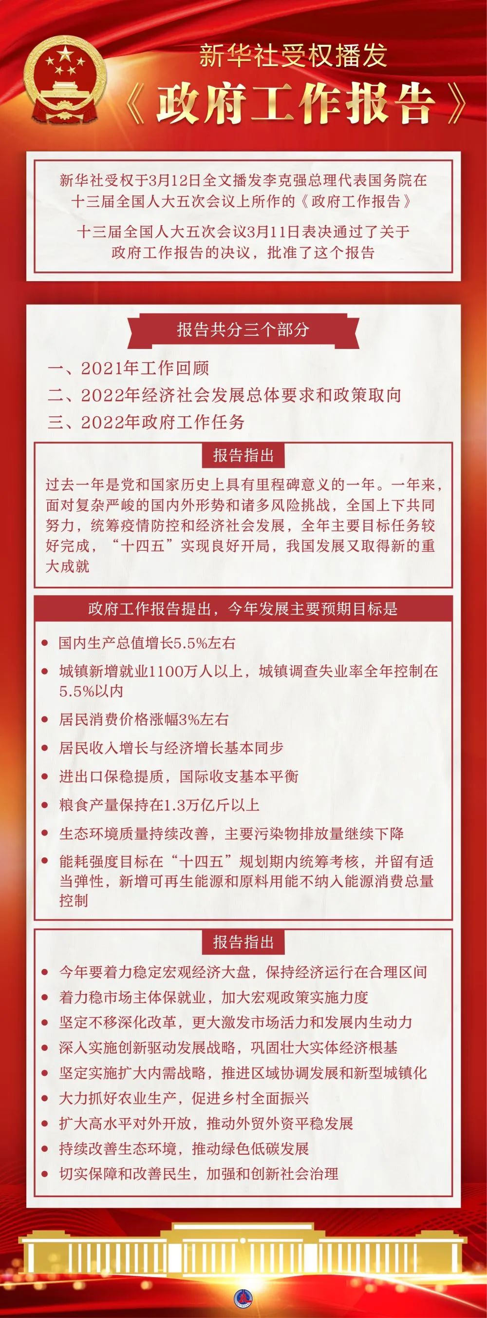 報告共分三個(ge) 部分:一、2021年工作回顧;二、2022年經濟社會(hui) 發展總體(ti) 要求和政策取向;三、2022年政府工作任務。