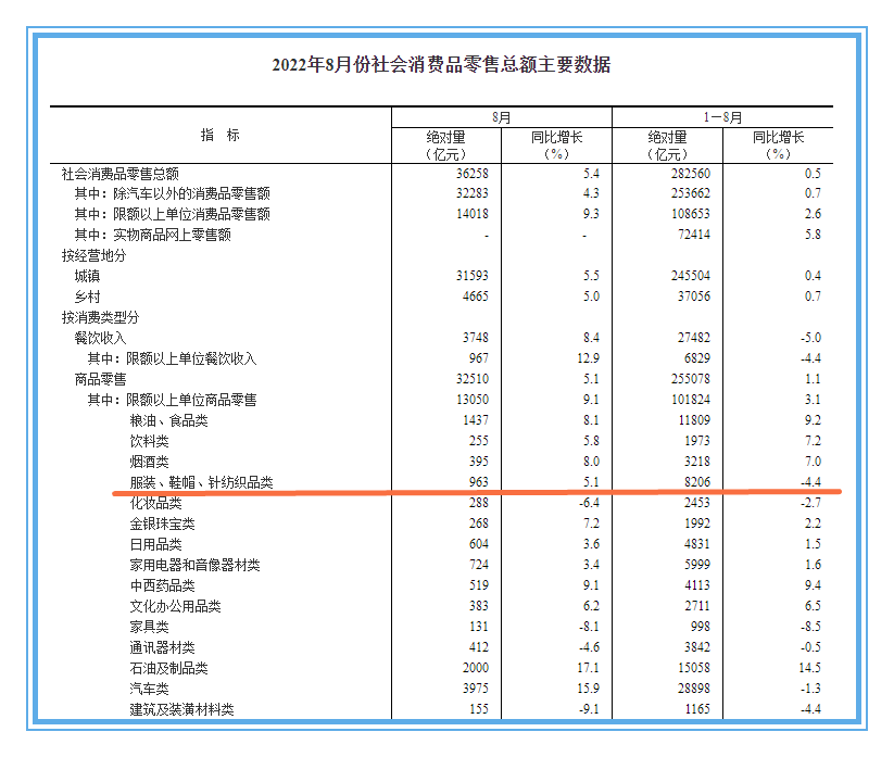8月,服裝鞋帽針紡織品類零售額增長5.1%,與(yu) 社會(hui) 消費品零售總額5.4%的增幅水平基本保持一致,好於(yu) 除汽車以外的消費品零售額4.3%的增幅水平。