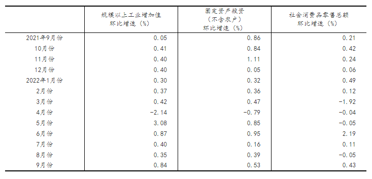 (2)根據季節調整模型自動修正結果,對近一年來各期國內(nei) 生產(chan) 總值、規模以上工業(ye) 增加值、固定資產(chan) 投資(不含農(nong) 戶)、社會(hui) 消費品零售總額環比增速進行修訂。修訂結果及2022年三季度GDP環比數據、2022年9月份其他指標環比數據如下: