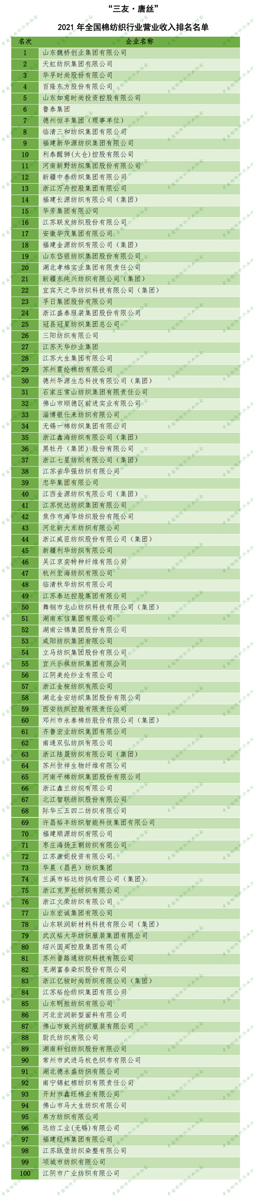2022年,根據“會(hui) 員參與(yu) 、自願申報、客觀排名”的原則,中國棉紡織行業(ye) 協會(hui) 繼續開展企業(ye) 營業(ye) 收入排名工作,並得到了廣大會(hui) 員企業(ye) 的大力支持與(yu) 積極響應。中國棉紡織行業(ye) 協會(hui) 現正式發布“三友·唐絲(si) ” 2021年全國棉紡織行業(ye) 營業(ye) 收入排名百強名單。本工作得到了唐山三友集團興(xing) 達化纖有限公司的大力支持!