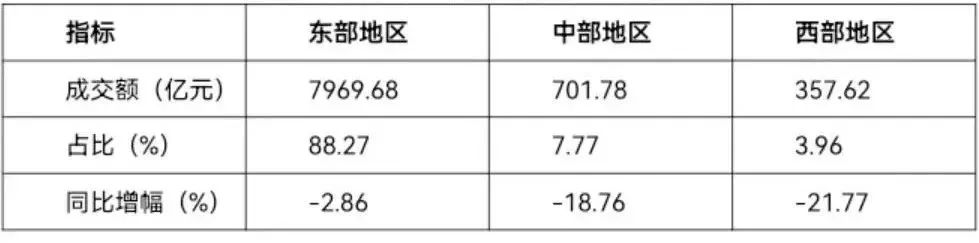 從(cong) 區域結構看,1-9月,46家重點監測市場中,東(dong) 部地區專(zhuan) 業(ye) 市場成交額為(wei) 7969.68億(yi) 元,同比下降2.86%,占到專(zhuan) 業(ye) 市場總成交額的88.27%;中部地區專(zhuan) 業(ye) 市場成交額為(wei) 701.78億(yi) 元,同比下降18.76%,占到專(zhuan) 業(ye) 市場總成交額的7.77%;西部地區專(zhuan) 業(ye) 市場成交額為(wei) 357.62億(yi) 元,同比下降21.77%,占到專(zhuan) 業(ye) 市場總成交額的3.96%。