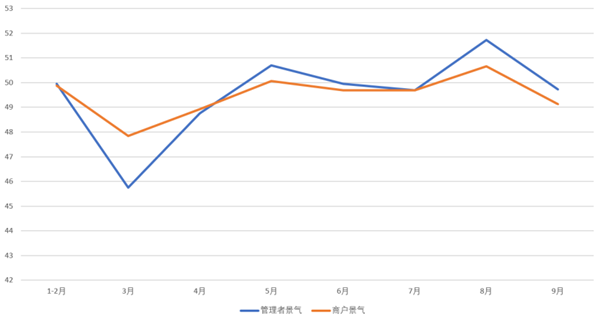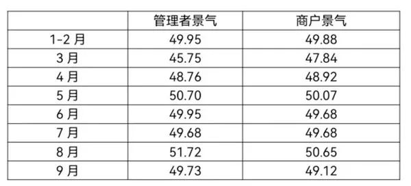 景氣方麵,2022年1-9月,紡織服裝專(zhuan) 業(ye) 市場管理者景氣與(yu) 商戶景氣走勢基本一致。管理者景氣平均指數為(wei) 49.53,商戶景氣平均指數為(wei) 49.48,均低於(yu) 50榮枯線;1-9月專(zhuan) 業(ye) 市場運管理者與(yu) 商戶整體(ti) 信心不足,景氣指數偏低。