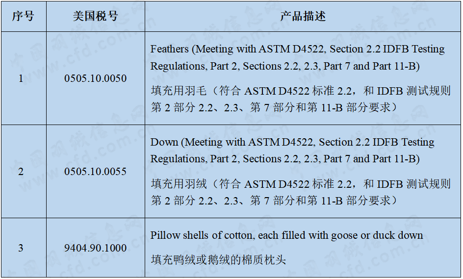 當地時間12月16日,美國貿易代表辦公室(USTR)在官網發布公告,將2022年3月豁免關(guan) 稅的352項產(chan) 品豁免期限從(cong) 2022年底延長九個(ge) 月,至2023年9月底,其中包括0505.10.0050填充用羽毛、0505.10.0055填充用羽絨和9404.90.1000填充鴨絨或鵝絨的棉質枕頭三項產(chan) 品(具體(ti) 見下表)。