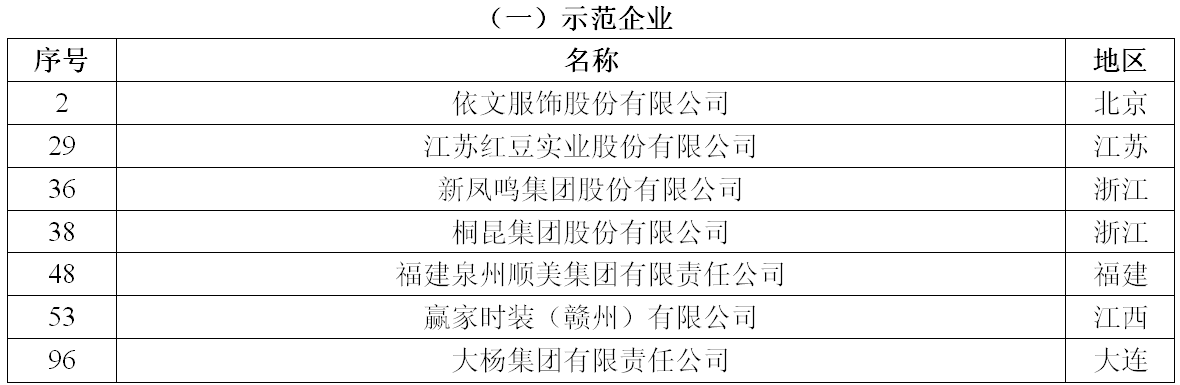 其中,依文服飾股份有限公司、江蘇紅豆實業(ye) 股份有限公司、新鳳鳴集團股份有限公司、桐昆集團股份有限公司、福建泉州順美集團有限責任公司、贏家時裝(贛州)有限公司、大楊集團有限責任公司列入示範企業(ye) 。