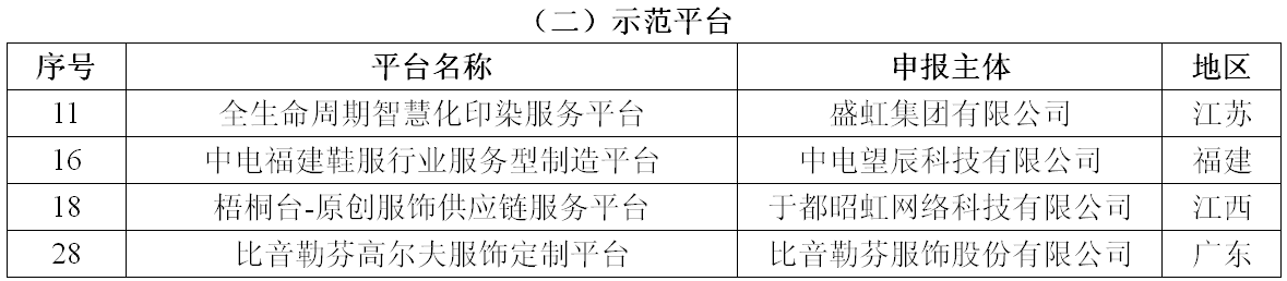 盛虹集團有限公司申報的全生命周期智慧化印染服務平台、中電望辰科技有限公司申報的中電福建鞋服行業(ye) 服務型製造平台、於(yu) 都昭虹網絡科技有限公司申報的梧桐台-原創服飾供應鏈服務平台、比音勒芬服飾股份有限公司申報的比音勒芬高爾夫服飾定製平台列入示範平台。