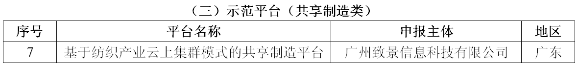 廣州致景信息科技有限公司申報的基於(yu) 紡織產(chan) 業(ye) 雲(yun) 上集群模式的共享製造平台列入示範平台(共享製造類)。