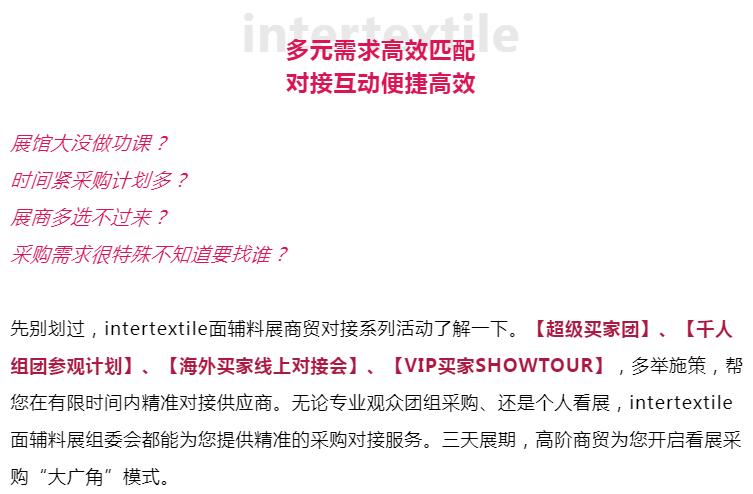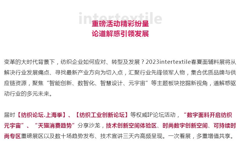 新年伊始,“鉚足幹勁來”、“力爭(zheng) 兔年開門紅”,行業(ye) 企業(ye) 紛紛摩拳擦掌、拚勁十足。近期,小編們(men) 不停被電話、郵件、小紅書(shu) 賬號、微信後台多渠道的專(zhuan) 業(ye) 觀眾(zhong) “輪番詢問轟炸”,也充分感受到了大家對2023intertextile春夏麵輔料展期待值已經拉滿!