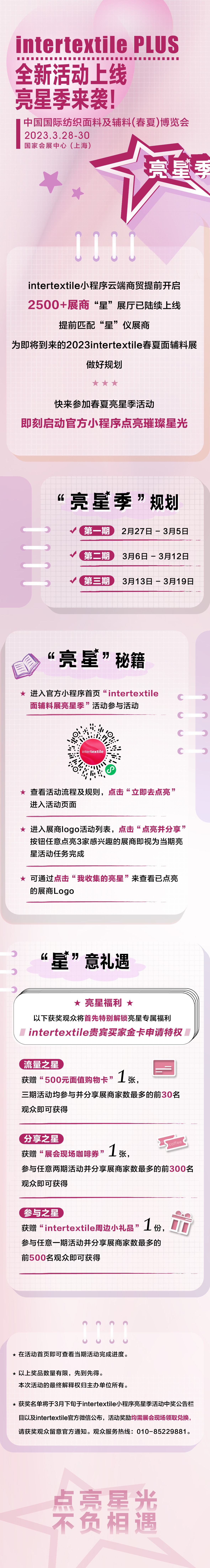 您現在的位置是:首頁 > 要聞 intertextile PLUS【預告】 “亮星季”即將光耀上線,雲端互動享好禮 來源:intertextile麵輔料展 發布日期:2023-02-24 字體: 【小】 【中】 【大】 分享: 熱門文章: 2025intertextile春夏 | “友禮”同享齊觀展... [2025-02-19] 2024年我國紡織行業經濟運行總體平穩 [2025-02-17] 聚焦綠色智慧融合 展示產業用紡織品新趨勢 [2025-02-11] 響應政策 落實服務 | PH Value義烏展全力“備戰”中 [2025-02-11] 【亮星季】第一期正式開啟 | 商貿先行,品質好禮享不停 [2025-02-10] 展會直通車