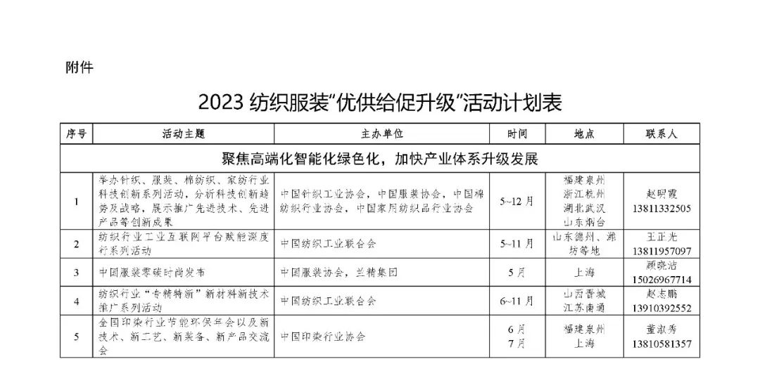 (一)加強組織協調。中國紡織工業(ye) 聯合會(hui) 按照《2023紡織服裝“優(you) 供給促升級”活動計劃表》(見附件)安排,精心策劃方案,抓好任務落實。各地工業(ye) 和信息化主管部門、商務主管部門結合本地實際和發展需要,組織開展本地區“優(you) 供給促升級”等方麵活動,並與(yu) 有關(guan) 行業(ye) 協會(hui) 和地方加強對接,形成合力統籌推動“優(you) 供給促升級”活動務實見效。