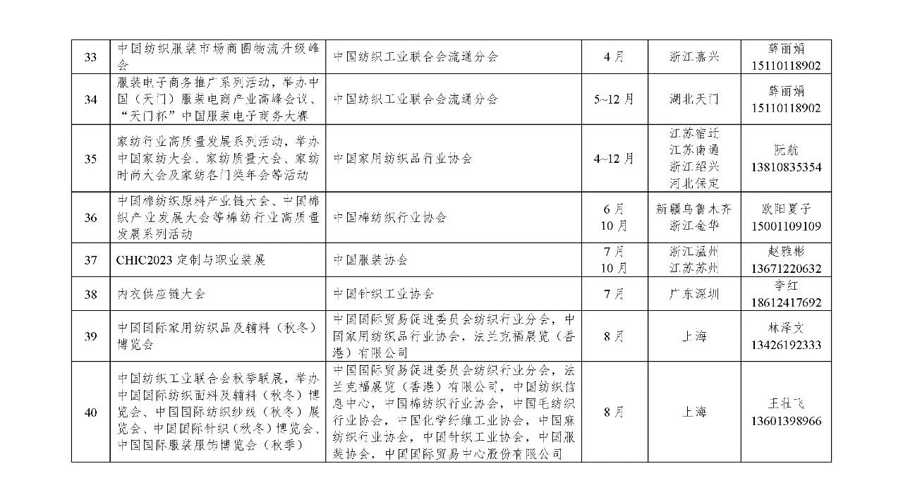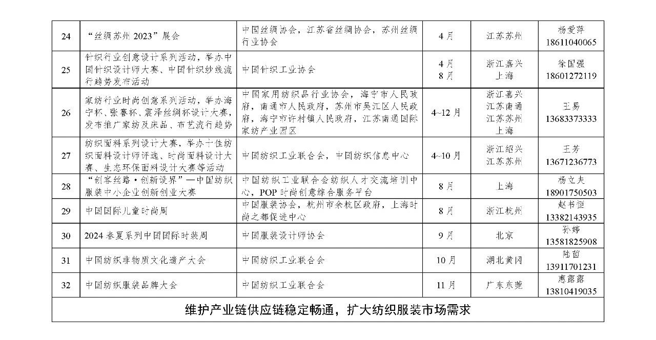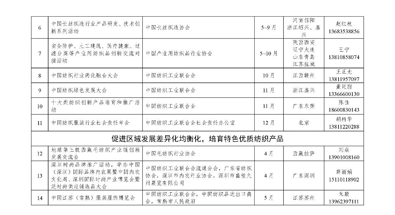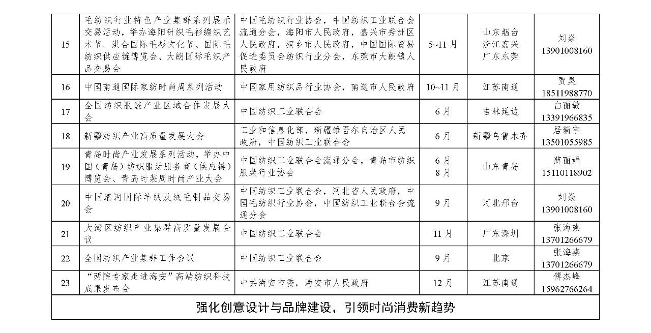 (三)注重工作實效。各單位在開展活動時,要明確目標,壓實責任,將各項活動的出發點和落腳點聚焦在紡織服裝穩增長、擴內(nei) 需、穩外需上。有關(guan) 行業(ye) 協會(hui) 要推動各項活動在信息交流、成果推廣、產(chan) 業(ye) 對接、國際合作等方麵落實落地,同時做好總結分析工作。各地工業(ye) 和信息化主管部門、商務主管部門要拿出具體(ti) 舉(ju) 措,組織開展具有當地產(chan) 業(ye) 特色的各類活動,有關(guan) 情況及時報送。