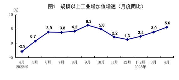 4月份,全國規模以上工業(ye) 增加值同比增長5.6%,比上月加快1.7個(ge) 百分點;環比下降0.47%。分三大門類看,采礦業(ye) 增加值同比持平,製造業(ye) 增長6.5%,電力、熱力、燃氣及水生產(chan) 和供應業(ye) 增長4.8%。裝備製造業(ye) 增加值同比增長13.2%,比上月加快5.3個(ge) 百分點。分經濟類型看,國有控股企業(ye) 增加值同比增長6.6%;股份製企業(ye) 增長4.4%,外商及港澳台商投資企業(ye) 增長11.8%;私營企業(ye) 增長1.6%。分產(chan) 品看,新能源汽車、太陽能電池產(chan) 品產(chan) 量同比分別增長85.4%、69.1%。1-4月份,全國規模以上工業(ye) 增加值同比增長3.6%,比1-3月份加快0.6個(ge) 百分點。4月份,製造業(ye) 采購經理指數為(wei) 49.2%,企業(ye) 生產(chan) 經營活動預期指數為(wei) 54.7%。