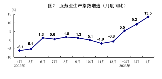 4月份,全國服務業(ye) 生產(chan) 指數同比增長13.5%,比上月加快4.3個(ge) 百分點。分行業(ye) 看,住宿和餐飲業(ye) ,批發和零售業(ye) ,交通運輸、倉(cang) 儲(chu) 和郵政業(ye) ,信息傳(chuan) 輸、軟件和信息技術服務業(ye) 生產(chan) 指數同比分別增長48.7%、18.8%、17.6%、13.2%,比上月分別加快18.8、7.9、5.7、1.2個(ge) 百分點。1-4月份,全國服務業(ye) 生產(chan) 指數同比增長8.4%,比1-3月份加快1.7個(ge) 百分點。1-3月份,規模以上服務業(ye) 企業(ye) 營業(ye) 收入同比增長5.0%。4月份,服務業(ye) 商務活動指數為(wei) 55.1%,業(ye) 務活動預期指數為(wei) 62.3%,其中,鐵路運輸、航空運輸、住宿、電信廣播電視及衛星傳(chuan) 輸服務、文化體(ti) 育娛樂(le) 等行業(ye) 商務活動指數位於(yu) 60%以上高位景氣區間。