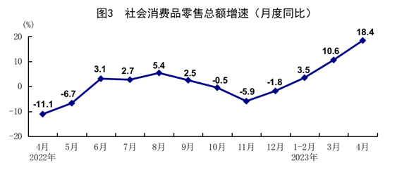 4月份,社會(hui) 消費品零售總額34910億(yi) 元,同比增長18.4%,比上月加快7.8個(ge) 百分點;環比增長0.49%。按經營單位所在地分,城鎮消費品零售額30398億(yi) 元,同比增長18.6%;鄉(xiang) 村消費品零售額4513億(yi) 元,增長17.3%。按消費類型分,商品零售31159億(yi) 元,增長15.9%;餐飲收入3751億(yi) 元,增長43.8%。升級類商品銷售增長較快,限額以上金銀珠寶類、體(ti) 育娛樂(le) 用品類、化妝品類商品零售額分別增長44.7%、25.7%、24.3%。1-4月份,社會(hui) 消費品零售總額149833億(yi) 元,同比增長8.5%,比1-3月份加快2.7個(ge) 百分點。全國網上零售額44108億(yi) 元,同比增長12.3%,比1-3月份加快3.7個(ge) 百分點。其中,實物商品網上零售額37164億(yi) 元,增長10.4%,占社會(hui) 消費品零售總額的比重為(wei) 24.8%。