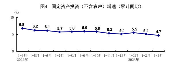 1-4月份,全國固定資產(chan) 投資(不含農(nong) 戶)147482億(yi) 元,同比增長4.7%,比1-3月份回落0.4個(ge) 百分點。分領域看,基礎設施投資同比增長8.5%,製造業(ye) 投資增長6.4%,房地產(chan) 開發投資下降6.2%。全國商品房銷售麵積37636萬(wan) 平方米,同比下降0.4%;商品房銷售額39750億(yi) 元,增長8.8%。分產(chan) 業(ye) 看,第一產(chan) 業(ye) 投資同比增長0.3%,第二產(chan) 業(ye) 投資增長8.4%,第三產(chan) 業(ye) 投資增長3.1%。民間投資增長0.4%。高技術產(chan) 業(ye) 投資同比增長14.7%,其中高技術製造業(ye) 和高技術服務業(ye) 投資分別增長15.3%、13.4%。高技術製造業(ye) 中,電子及通信設備製造業(ye) 、醫療儀(yi) 器設備及儀(yi) 器儀(yi) 表製造業(ye) 投資分別增長19.9%、19.4%;高技術服務業(ye) 中,科技成果轉化服務業(ye) 、專(zhuan) 業(ye) 技術服務業(ye) 投資分別增長42.1%、33.9%。社會(hui) 領域投資增長5.6%,其中衛生、教育投資分別增長13.8%、5.0%。4月份,固定資產(chan) 投資(不含農(nong) 戶)環比下降0.64%。