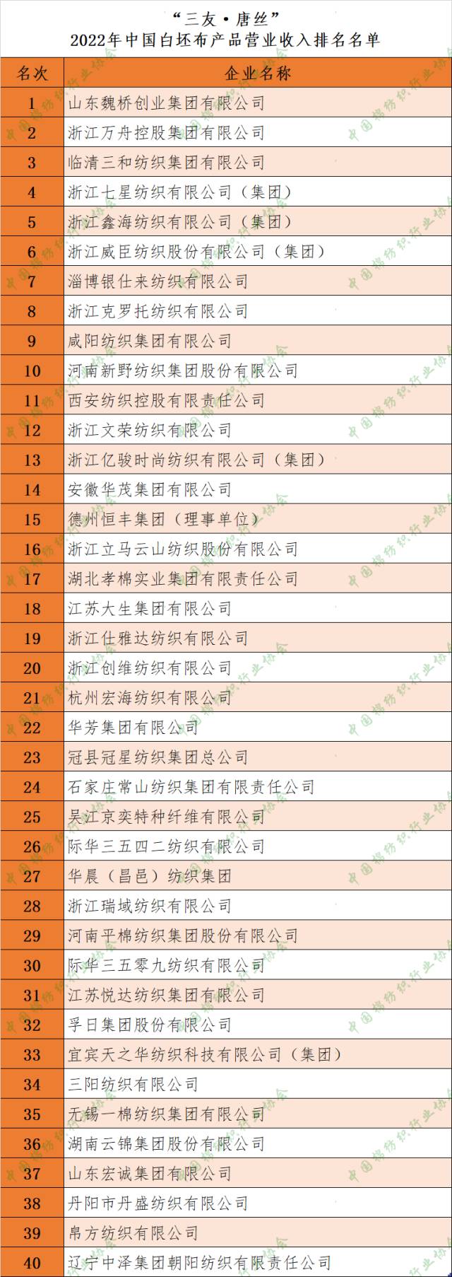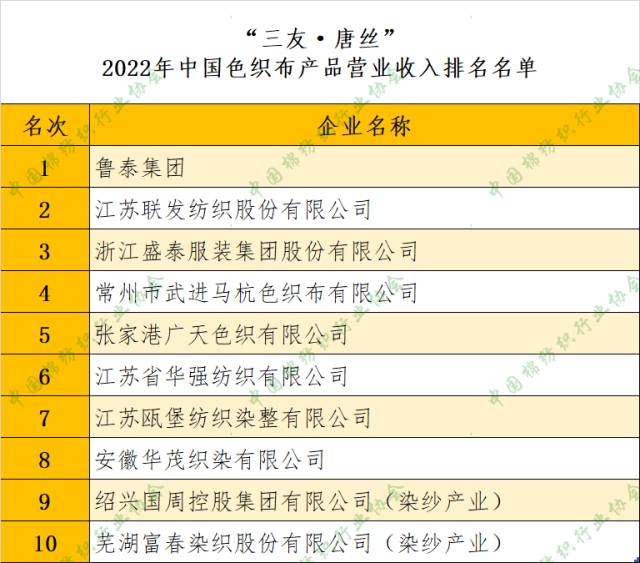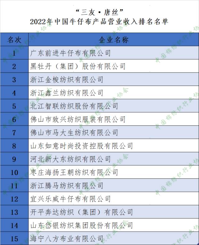 您現在的位置是:首頁 > 要聞 【權威發布】2022年中國棉紡織行業分類產品(白坯布、色織布、牛仔布)主營業務收入排名名單 來源:中棉行協 發布日期:2023-06-07 字體: 【小】 【中】 【大】 中國棉紡織行業(ye) 協會(hui) 現發布“三友·唐絲(si) ”2022年中國棉紡織行業(ye) 分類產(chan) 品“白坯布前40名”、“色織布前10名”、“牛仔布前15名”企業(ye) 名單。 感謝唐山三友集團興(xing) 達化纖有限公司的大力支持,感謝廣大會(hui) 員企業(ye) 的積極配合! 分享: 熱門文章: 2025intertextile春夏 | “友禮”同享齊觀展... [2025-02-19] 2024年我國紡織行業經濟運行總體平穩 [2025-02-17] 聚焦綠色智慧融合 展示產業用紡織品新趨勢 [2025-02-11] 響應政策 落實服務 | PH Value義烏展全力“備戰”中 [2025-02-11] 【亮星季】第一期正式開啟 | 商貿先行,品質好禮享不停 [2025-02-10] 展會直通車