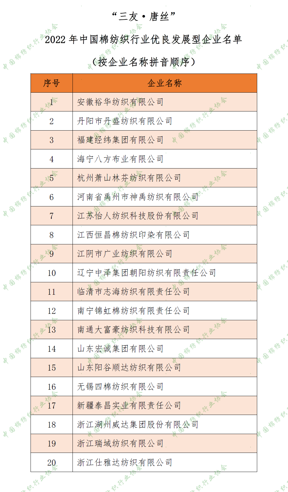 5月18日,中國棉紡織行業(ye) 協會(hui) 向全社會(hui) 發布了“三友·唐絲(si) ”2022年中國棉紡織行業(ye) 營業(ye) 收入排名百強企業(ye) 名單。除百強企業(ye) 外,為(wei) 鼓勵並推動棉紡織中小企業(ye) 高質量發展,對符合條件的企業(ye) 推薦為(wei) “2022年中國棉紡織行業(ye) 優(you) 良發展型企業(ye) ”,現將名單予以公布,該名單排名不分先後。