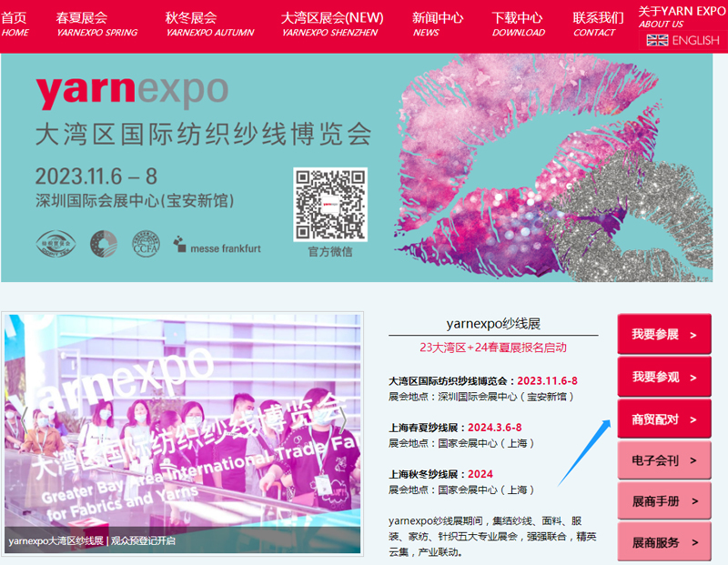 2023大灣區國際紡織紗線博覽會(hui) 將於(yu) 11月6-8日在深圳國際會(hui) 展中心(寶安新館)9展廳盛大啟幕。【商貿預約】係統正式上線。7大專(zhuan) 業(ye) 展區,100+優(you) 質纖維紗線展商將與(yu) 您近距離交流互動。本屆博覽會(hui) 將綠色、功能與(yu) 時尚外觀結合,引領可持續時尚潮流。