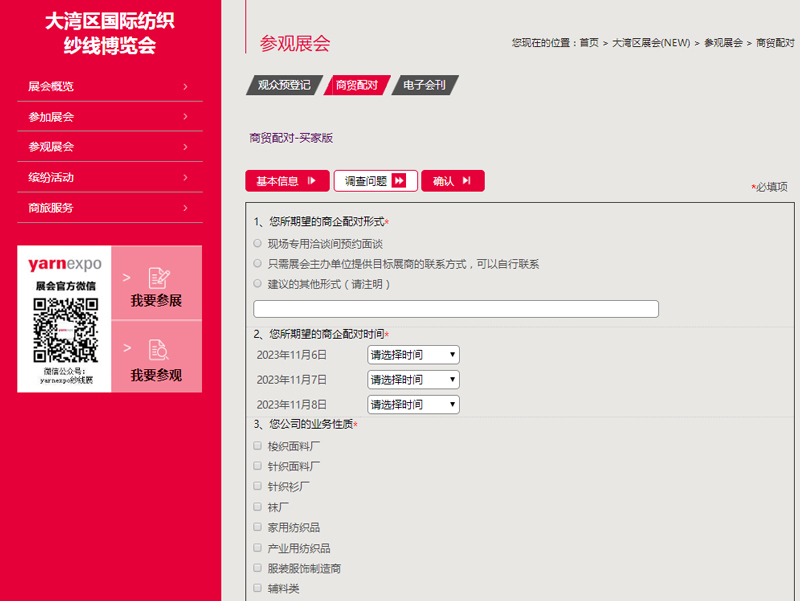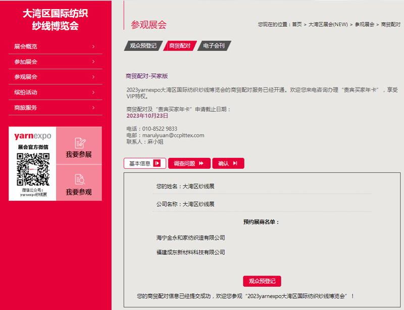 填寫(xie) 並提交您的基本信息及調查問題,主辦單位進行後台審核,將有專(zhuan) 人與(yu) 您聯係商貿預約具體(ti) 事宜。主辦谘詢電話:010-85229833。