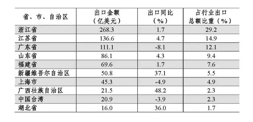 隨著中、西部省市自治區高水平承接發展紡織產業,不斷提升競爭力,部分省市自治區紡織服裝產品出口額實現穩定增長。今年1~4月,西部12省市合計出口紡織品服裝95.2億美元,同比增長28.7%,其中新疆維吾爾自治區出口紡織服裝產品50.8億美元,漲幅高達37.1%,躍居全國第五;廣西壯族自治區紡織品服裝出口額為21.5億美元,同比增長48.2%。中部6省中,湖北省出口紡織品服裝16億美元,同比大幅增長36%。