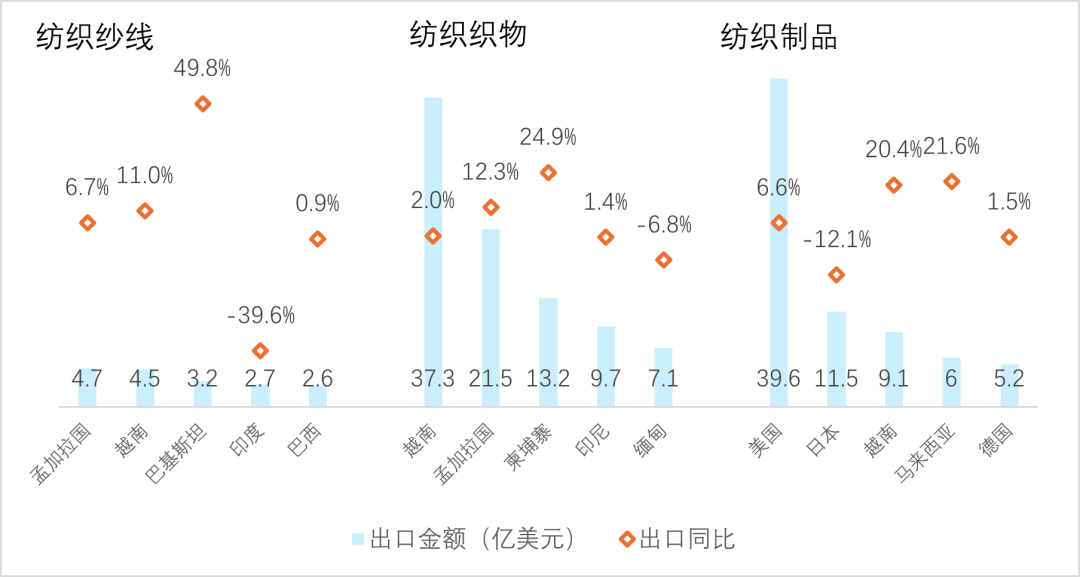 圖3 我國對部分主要國家出口紡織紗線、織物及製品統計