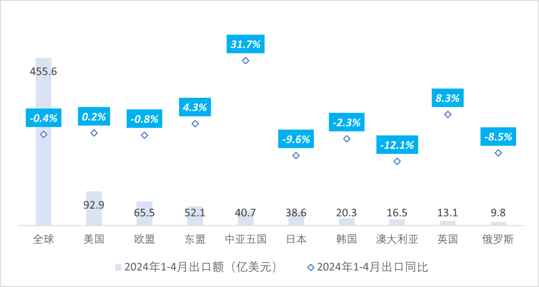 今年1~4月我國對全球出口服裝及衣著附件455.6億美元,同比微降0.4%。其中,我國對美國、東盟、英國等主要市場出口服裝金額保持平穩增長,對中亞五國服裝出口額同比大幅增長31.7%,特別是對哈薩克斯坦出口增速高達90%。