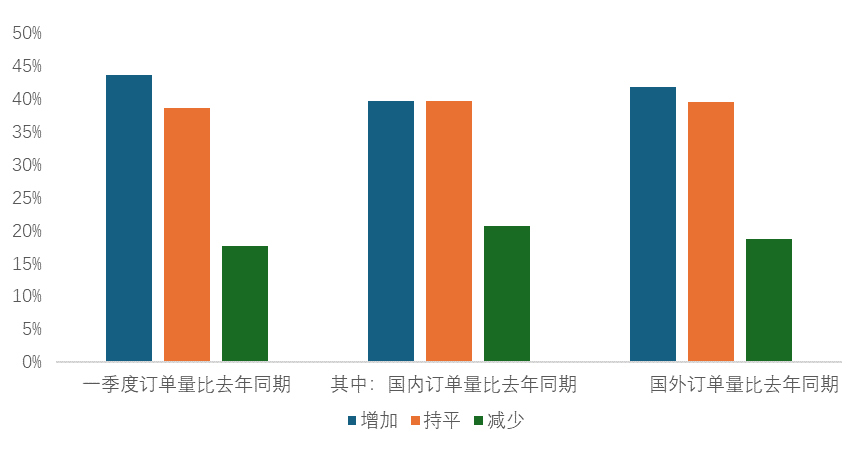 從主要子行業情況看,布藝企業訂單表現更為突出。一季度訂單同比增加的企業占52.17%,另有41.30%的企業訂單保持持平。床上用品企業訂單同比增加的占45.45%,持平的企業占34.09%;毛巾企業訂單同比增加的占比為28%,與上年同期持平的占39%。